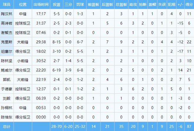 陶漢林和陳林堅是全隊僅有的評分超過9分的球員。陶漢林從比賽伊始就展現了出色的狀態,卻僅得到17分鐘的出場時間,但依舊貢獻了11分3籃板1助攻1搶斷1蓋帽,獲評9.4分。可惜,在邱彪的戰術里,他根本沒有立足之地。陳林堅得到10分2籃板1助攻,同樣獲評9.4分。令人遺憾的是,邱彪的戰術仍然沒有圍繞他展開。當高詩巖和于德豪同時在場時,青島隊對陳林堅的防守就更加有針對性,令其每一次觸球都非常困難。