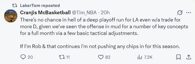 美媒CMB寫道:就算LAL交易得到更多防守球員我也不覺得他們能在季后賽中取得成果。因為過去一個月我發現這支湖人不僅是防守差,他們的進攻體系在多個關鍵方面都出現了嚴重的問題,而這些問題不是一些基礎的戰術調整就能改變的,如果我不是佩林卡,這些問題在交易截止日前解決不了,我是不會進行任何交易投入的。