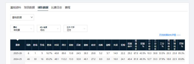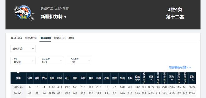 成績方面,新疆男籃也有退步。上賽季常規賽,他們的勝率可達到69.6%;本賽季6輪過后,球隊勝率僅為33.3%。