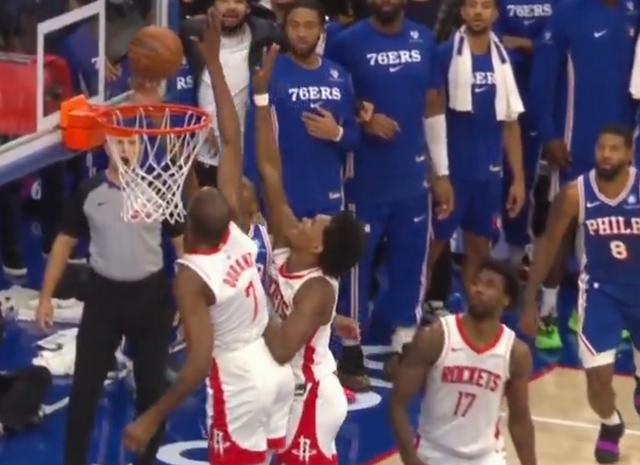 比賽末節(jié)最后時(shí)刻,雙方115-115戰(zhàn)平,76人后衛(wèi)馬克西持球突破沖進(jìn)內(nèi)線完成上籃,在籃球觸碰到籃板后,火箭前鋒杜蘭特再次觸碰籃球,按照規(guī)則應(yīng)該是干擾球違例,但裁判并未吹罰。