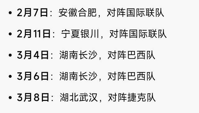 2月、3月的五場熱身賽時間如下: