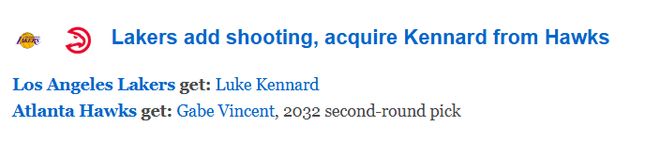 北京時間2月6日,在NBA的交易截止日,湖人完成了一筆2換1的交易,送出文森特和一個2032年的次輪簽,從老鷹得到神射手肯納德。隨后ESPN對這筆交易進行評級——